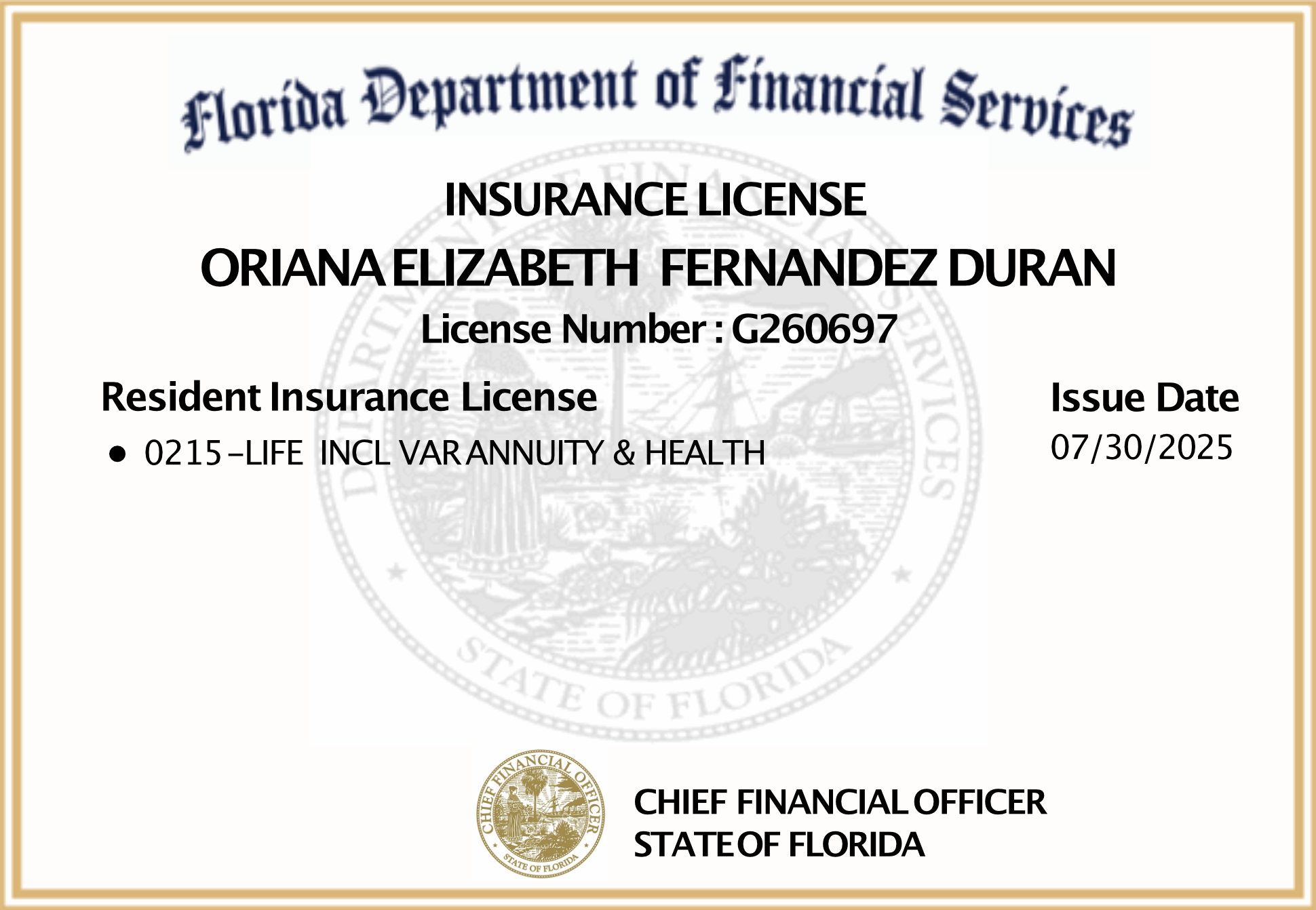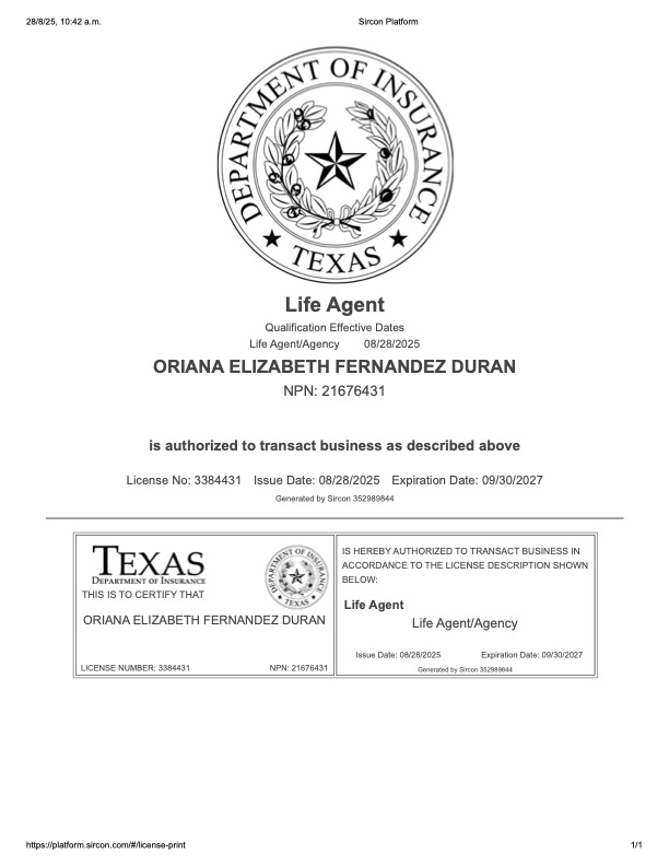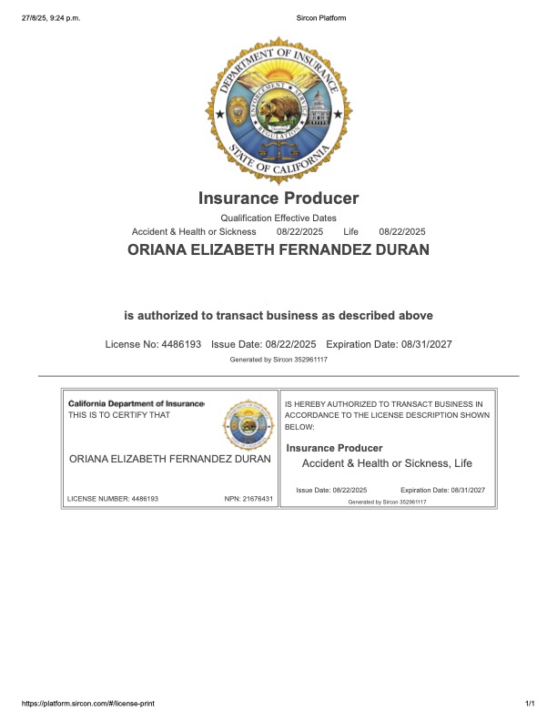 Soy un agente de seguros licenciado en más de 10 estados de los Estados Unidos, cumpliendo con todos los requisitos y regulaciones tanto a nivel estatal como federal.